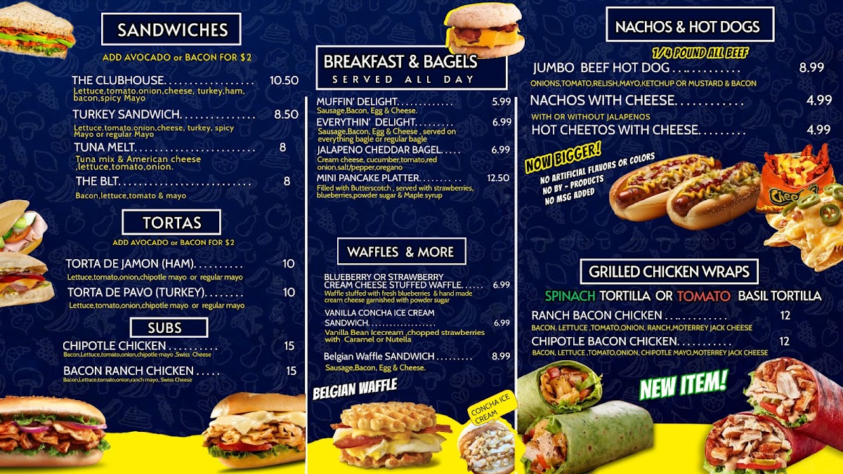 For a more savory bite, the Torta De Jamon and Torta De Pavo are deliciously satisfying, and the Belgian Waffle Sandwich adds a sweet and savory option for those craving a fusion. The Chipotle Chicken Sub and Bacon Ranch Chicken Sub deliver bold flavors, while the Ranch Bacon Chicken Grilled Wrap and Chipotle Bacon Chicken Wrap are perfect for a light, on-the-go meal.