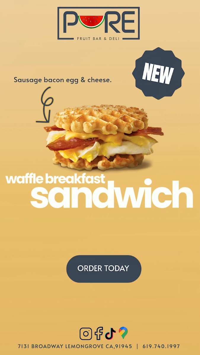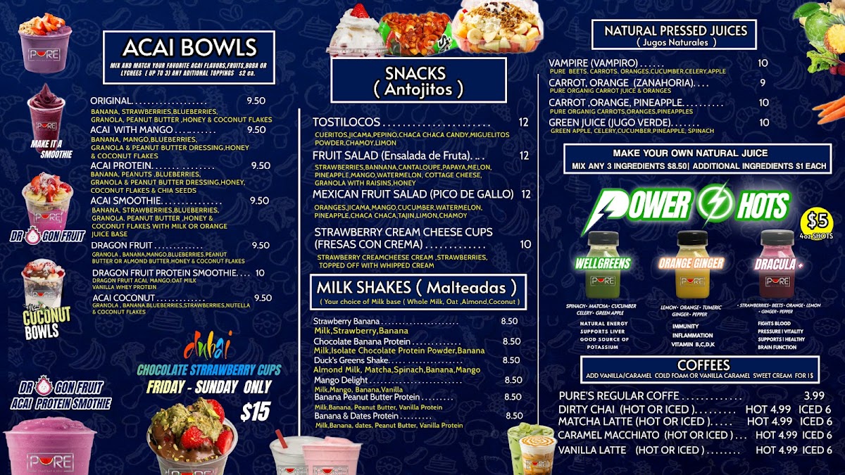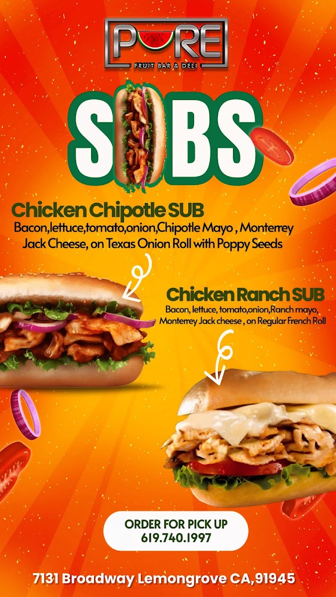 At Pure Fruit Bar & Deli, the menu offers a delightful variety of options perfect for any craving. For those in the mood for a hearty meal, the Clubhouse and Turkey Sandwich are standout choices, while the Tuna Melt and BLT provide classic comfort with a twist. If you’re craving something crunchy, the Jumbo Beef Hot Dog and Nachos with Cheese won’t disappoint. Breakfast lovers can indulge in the Muffin’ Delight or the Mini Pancake Platter, while the Jalapeno Cheddar Bagel offers a spicy kick.